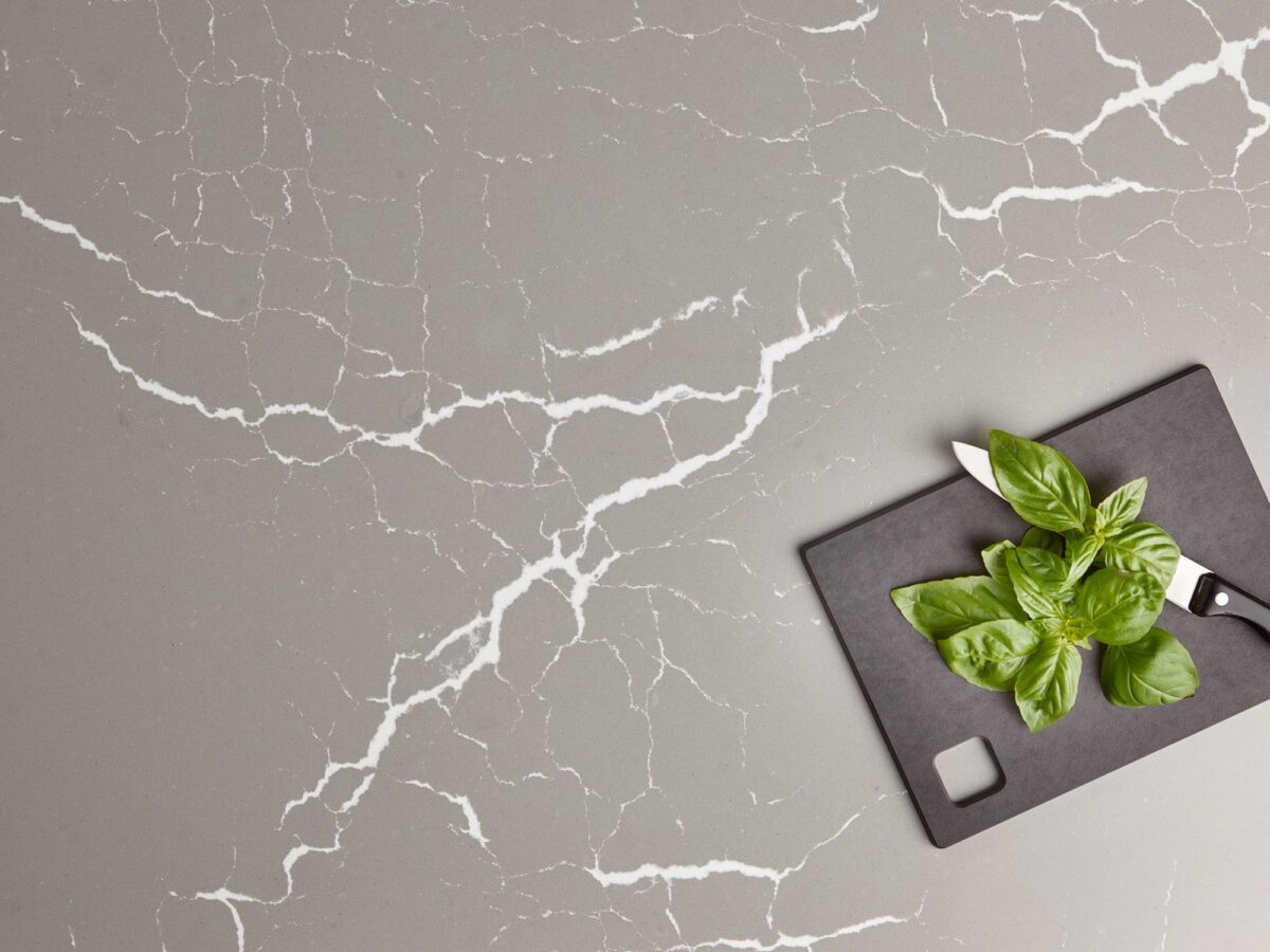 Cambria Clare Quartz is a gray design with a light gray base, with white crackled veining throughout the slab. It embraces the look of natural marble with the great benefits of Cambria quartz kitchen countertops.